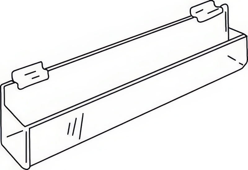 These racks slope downward, very suitable for displaying greeting cards, books, videos, and software cartridges. 21/2" front lip. 31/2" back. Depth is 13/4" outside, 11/2" inside. 1/8" thick acrylic.