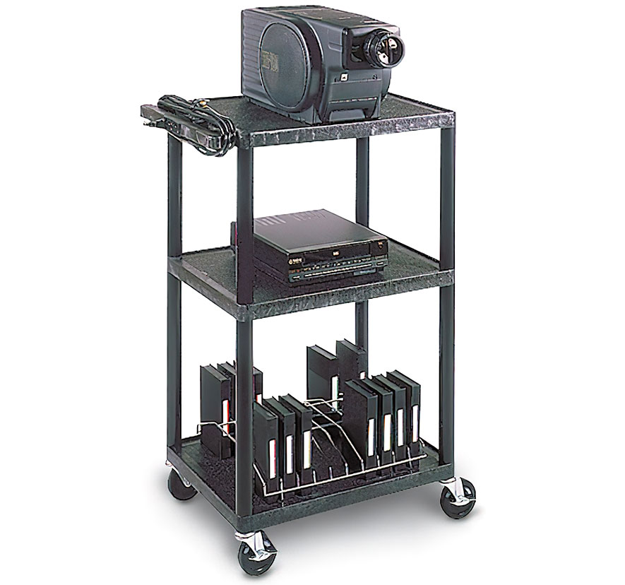 These durable open shelf carts won't scratch, dent, or rust. All carts feature a retaining lip around each shelf, a cabling hole in the top shelf for cord management, and an integral safety push handle and cord wrap. Patented "electric in handle" design. Assembly required.