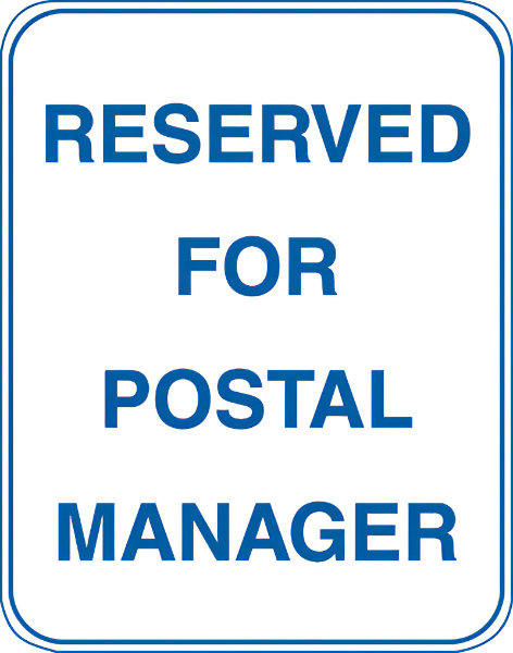 TYPE: STREET SIGN. Aluminum Parking Lot Sign. WORDING: "RESERVED FOR POSTAL MANAGER." SIZE: 12" x 18". COLOR: BLACK ON WHITE. SIGN POSTS: Sold separately. See N1026445. ACCESSORIES N1014758-N1014759 Fence Mount Brackets. SHIPPING: USPS.
