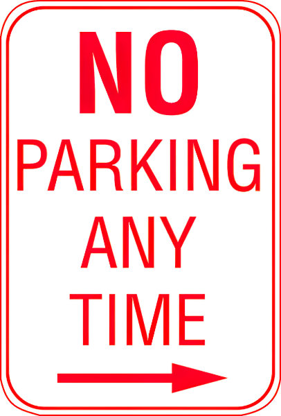 TYPE: STREET SIGN. Aluminum Parking Lot Sign. WORDING: "NO PARKING ANYTIME (Right Arrow)." SIZE: 12" x 18". COLOR: BLACK ON WHITE. SIGN POSTS: Sold separately. See N1026445. ACCESSORIES N1014758-N1014759 Fence Mount Brackets. SHIPPING: USPS.