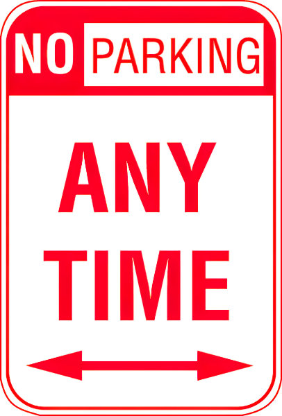 TYPE: STREET SIGN. Aluminum Parking Lot Sign. WORDING: "NO PARKING ANYTIME (Double Arrow)." SIZE: 12" x 18". COLOR: BLACK ON WHITE. SIGN POSTS: Sold separately. See N1026445. ACCESSORIES N1014758-N1014759 Fence Mount Brackets. SHIPPING: USPS.
