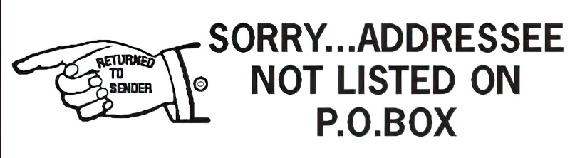This returned to sender stamp reads, "Sorry... Addressee not listed on P.O. box". The easily refillable phrase stamps are good for thousands of impressions before re-inking. Custom stamps are available with your copy, city, and state.