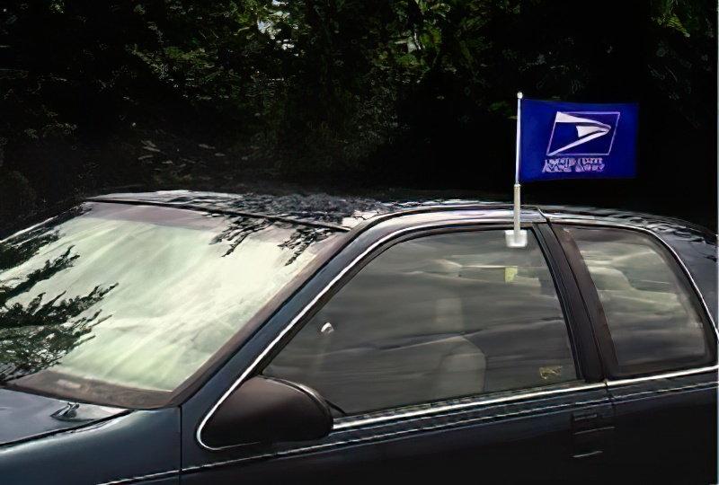 Show your postal spirit in your car with this double-sided auto window flag. Each USPS flag features a two-sided logo imprint and is constructed of durable polyester fiber and a hard plastic pole, ensuring it can stand up to the elements. Ships USPS.