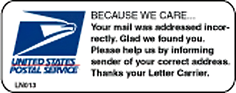 Labels read "Because we care... Your mail was addressed incorrectly. Glad we found you. Please help us by informing sender of your correct address. Thanks your Letter Carrier."