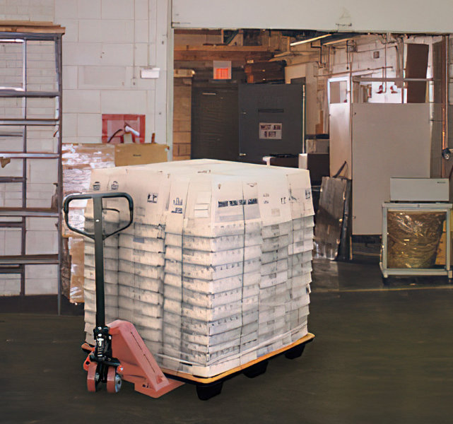 Excellent for bulk mail entry unit docks. Move skids of trayed mail without tying up forklifts. With its sloped rounded fork nose and user friendly entry/exit rollers, it's easy to load and unload pallets. Power assist pallet trucks help reduce back strain. By pumping the handle, the user not only lifts the fork, but also activates the power drive accumulator which with a simple pull of the handle begins to roll the truck automatically. Each stroke of the handle provides 2 ft. of driving momentum.