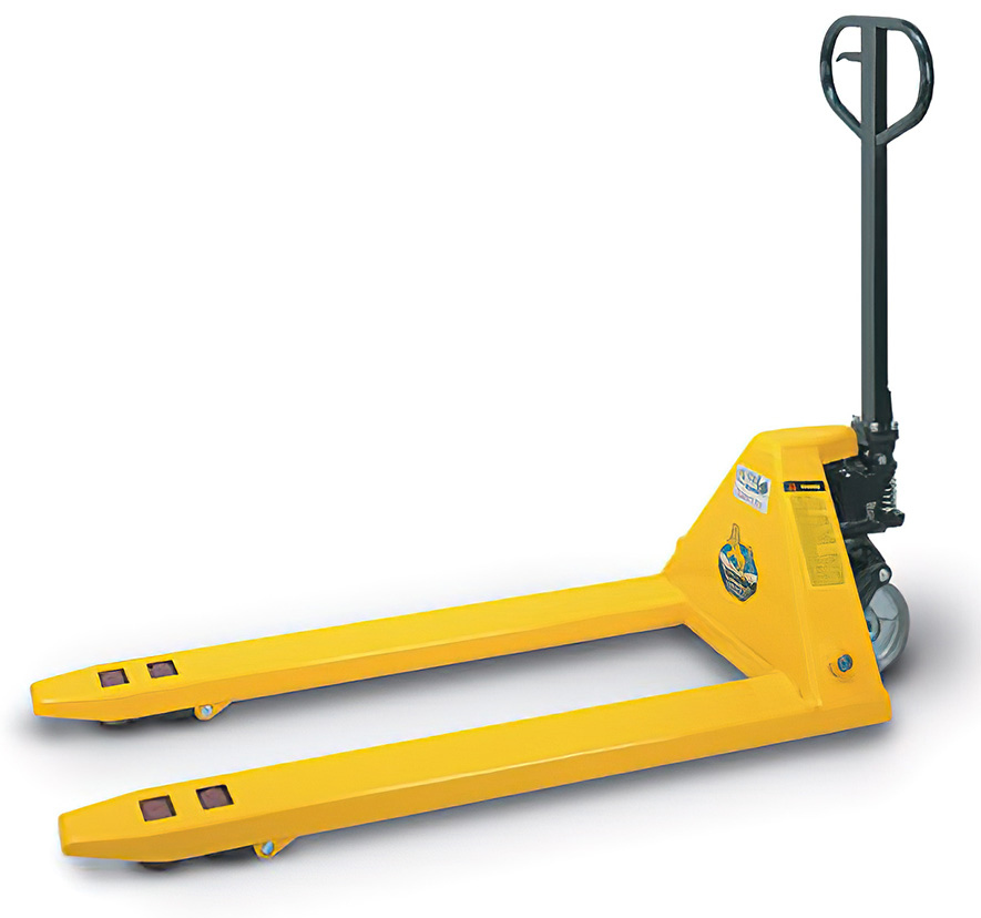 Excellent for bulk mail entry unit docks. Move skids of trayed mail without tying up forklifts. With its sloped rounded fork nose and user friendly entry/exit rollers, it's easy to load and unload pallets. Power assist pallet trucks help reduce back strain. By pumping the handle, the user not only lifts the fork, but also activates the power drive accumulator which with a simple pull of the handle begins to roll the truck automatically. Each stroke of the handle provides 2 ft. of driving momentum.