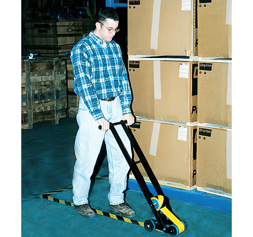 The Floor Tape Dolly makes it easy to apply tape accurately, evenly and securely. Because the applicator head is adjustable, these units are able to apply tape around corners. The rear stabilizer is also adjustable, allowing for accurate marking next to wall or pallet racks.