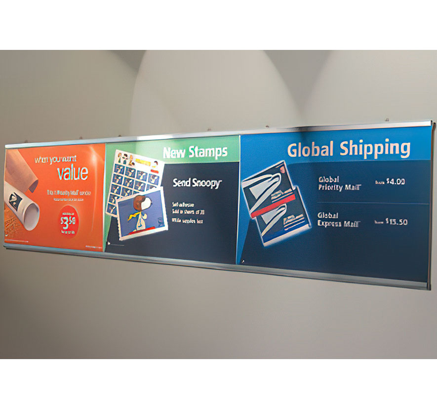Use this sign hardware to hang graphics from the ceiling, wall, or window. Once installed, units are easily changeable. Simply snap open the side load frame, remove the plastic protector, change the graphics in the protector, and place the plastic protector back in the frame.