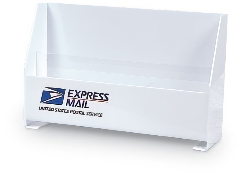 Our two compartment forms holders make Express Mail Forms highly visible. Equipped with fold-over legs, these units are free-standing and built with durable 1/8" acrylic. Front of holder has a pre-screened two color logo. Units are also wall mountable. Please call for details. Size is 20"W x 5 1/4"D x 13"H.