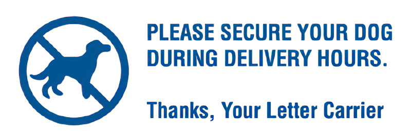 The postal labels read, "Please secure your dog during delivery hours. Thanks, Your Letter Carrier"