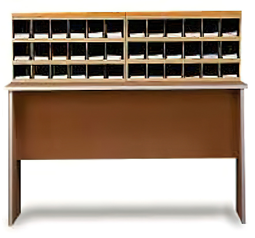 A variety of cases have been developed for accommodating different levels of restricted duty. Our standard unit (N1014516) has fifty 5" x 5" cells manufactured from high pressure laminate into two independent sorters. The sorters are mounted onto a 3/4" plywood base built on 4" x 4" legs with locking casters. Straight table sold separately.