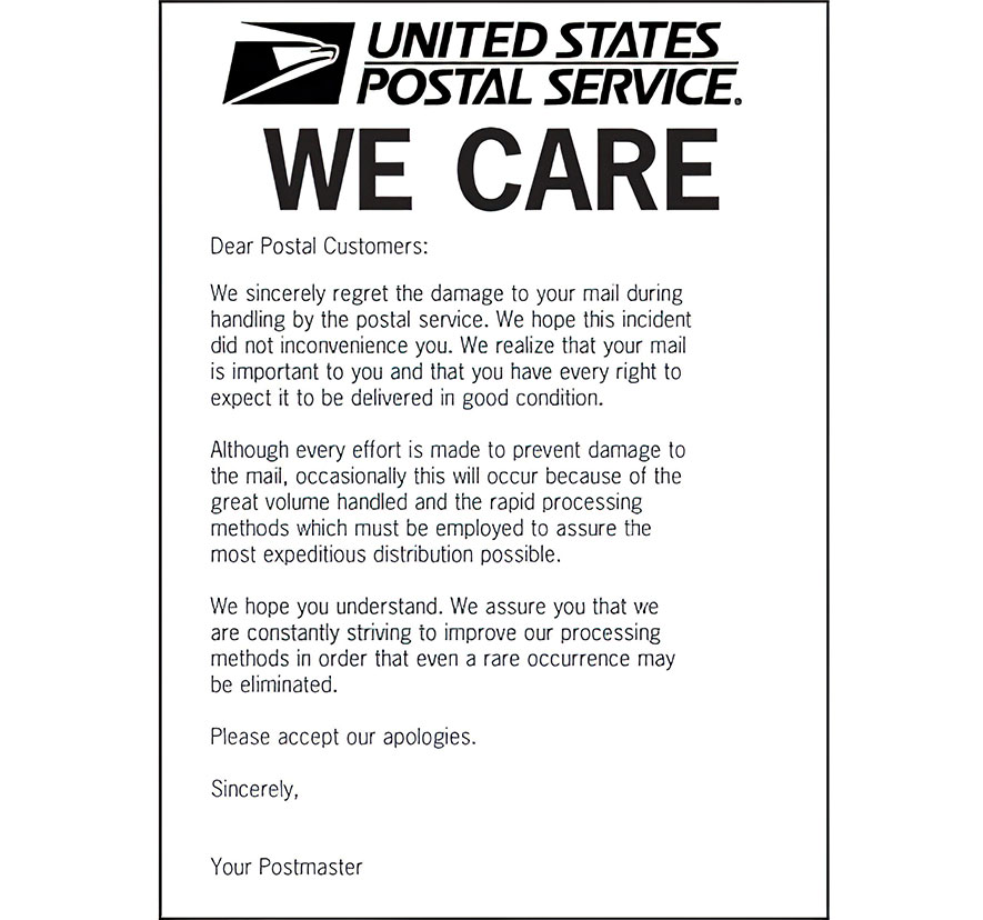 Damaged Mail Bags. Roll Style 5"wx11"h "we Care..." Qty 1 Roll=1250 N1000151