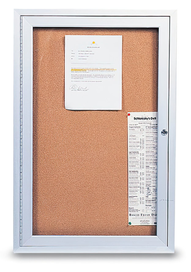 Display important messages with our durable and stylish satin anodized aluminum framed Indoor Enclosed Corkboards. Top-quality, self-sealing natural cork is protected by a durable, shatter-resistant acrylic window so messages can be seen but not touched. Lockable door protects against vandalism while controlling access to posting surface. Front door is mounted on full-length piano hinges. Case dimensions: 1" wide main frame, 1 7/16" wide door frame, 2" exterior depth, 5/8" interior depth, 31/8" illuminated exterior depth, and 15/8" illuminated interior depth. Available in 1, 2, and 3 door models. Professional-looking top header with illumination option is available. Boards with no header can also be illuminated. Two keys included. Custom sizes are also available. Call a Customer Service Representative today!