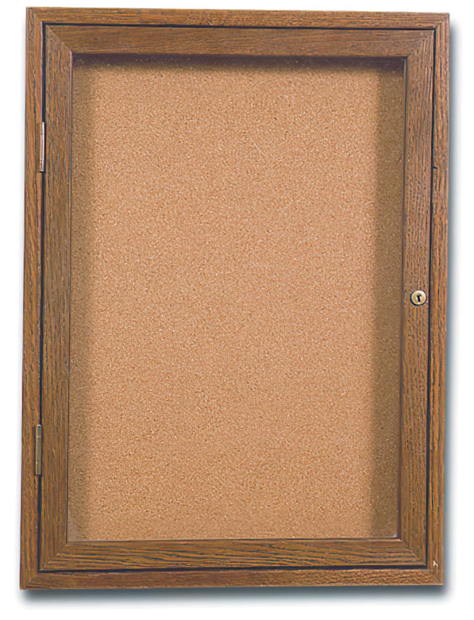This enclosed, lockable, wood framed bulletin board has a clear acrylic shatter-resistant window displaying messages for all to see while keeping them untouched. Solid disc tumbler locks control access to the corkboard message surface as well as protect against vandalism. A set of 290 white Helvetica font letters and numbers is included (3/4" high).