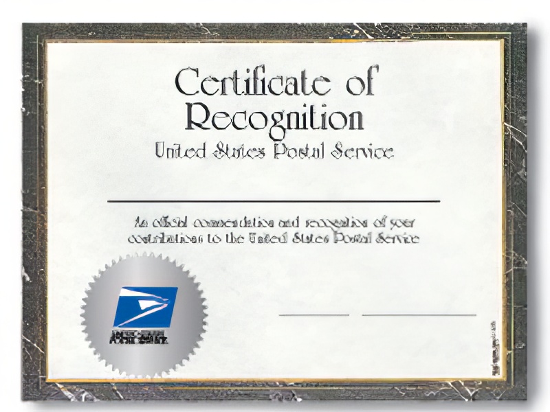 The Certificate of Recognition may be customized with an individual employee's name, district, and the date. If a year is not specified, the current year will be used. These awards, featuring the USPS logo, are an excellent way raise moral by showing Postal employees how much they are appreciated!