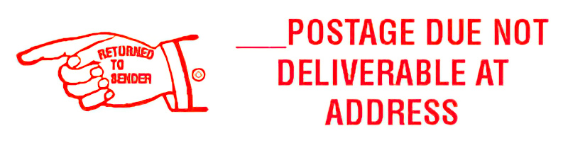 These heavy-duty pre-inked stamps deliver thousands of impressions before re-inking. Most ship in 48 hours. The postal stamps read, "Returned to Sender: Postage Due Not Deliverable at Address".