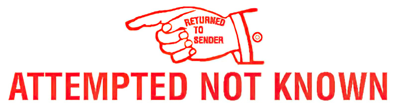 This returned to sender stamp reads, "Attempted not known". The easily refillable phrase stamps are good for thousands of impressions before re-inking. Custom stamps are available with your copy, city, and state.