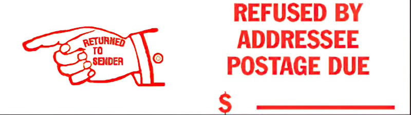 This returned to sender stamp reads, "Refused by addressee. Postage due: $". The easily refillable phrase stamps are good for thousands of impressions before re-inking. Custom stamps are available with your copy, city, and state.