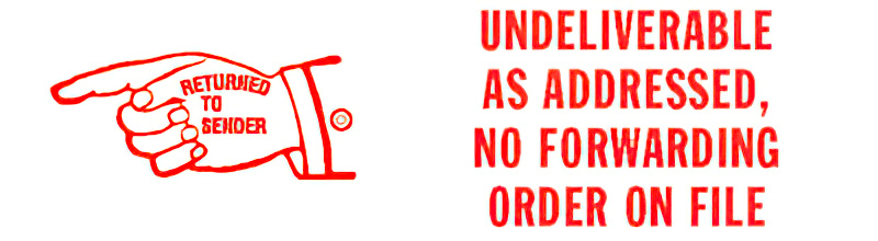 These returned to sender stamps read, "Undeliverable as addressed, no forwarding order on file". The easily refillable phrase stamps are good for thousands of impressions before re-inking. Custom stamps are available with your copy, city, and state.