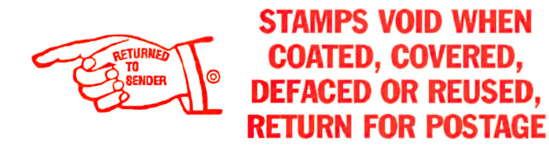 This returned to sender postal stamp reads, "Stamps void when coated, covered, defaced or reused, return for postage." The easily refillable phrase stamps are good for thousands of impressions before re-inking. Custom stamps are available with your copy, city, and state.
