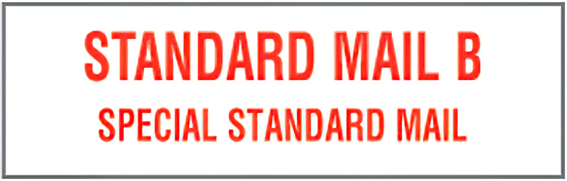 TYPE: Rubber Stamp. IMPRESSION: "STANDARD MAIL B SPECIAL STANDARD MAIL." IMPRESSION SIZE: 1/2"H x 1-11/16"W. INK COLOR: None. MOUNT: Made with ergonomically designed plastic handle, high-quality laser-cut rubber die. PLEASE NOTE: INK PAD SOLD SEPARATELY (). ACCESSORIES: Refill Ink, model numbers N1024685-N1024694, Stamp Pad: model numbers N1015892, N1015447, N1002548-N1002549. SHIPS: USPS.