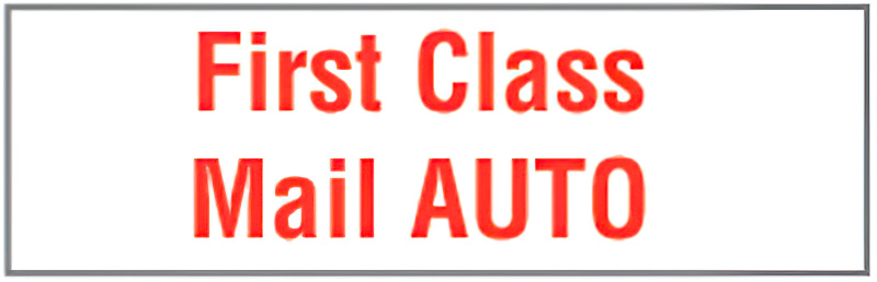 TYPE: Rubber Stamp. IMPRESSION: "FIRST CLASS MAIL AUTO." IMPRESSION SIZE: 1/2"H x 1-11/16"W. INK COLOR: None. MOUNT: Made with ergonomically designed plastic handle, high-quality laser-cut rubber die. PLEASE NOTE: INK PAD SOLD SEPARATELY (). ACCESSORIES: Refill Ink, model numbers N1024685-N1024694, Stamp Pad: model numbers N1015892, N1015447, N1002548-N1002549. SHIPS: USPS.