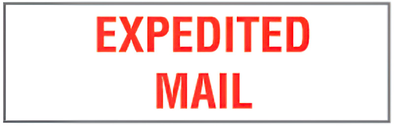 TYPE: Rubber Stamp. IMPRESSION: "EXPEDITED MAIL." IMPRESSION SIZE: 1/2"H x 1-11/16"W. INK COLOR: None. MOUNT: Made with ergonomically designed plastic handle, high-quality laser-cut rubber die. PLEASE NOTE: INK PAD SOLD SEPARATELY (). ACCESSORIES: Refill Ink, model numbers N1024685-N1024694, Stamp Pad: model numbers N1015892, N1015447, N1002548-N1002549. SHIPS: USPS.