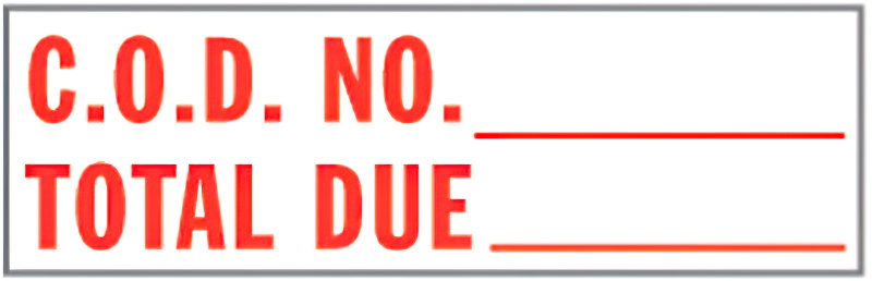 TYPE: Rubber Stamp. IMPRESSION: "C.O.D. NO:________ TOTAL DUE:_________" IMPRESSION SIZE: 1/2"H x 1-11/16"W. INK COLOR: None. MOUNT: Made with ergonomically designed plastic handle, high-quality laser-cut rubber die. PLEASE NOTE: INK PAD SOLD SEPARATELY (). ACCESSORIES: Refill Ink, model numbers N1024685-N1024694, Stamp Pad: model numbers N1015892, N1015447, N1002548-N1002549. SHIPS: USPS.