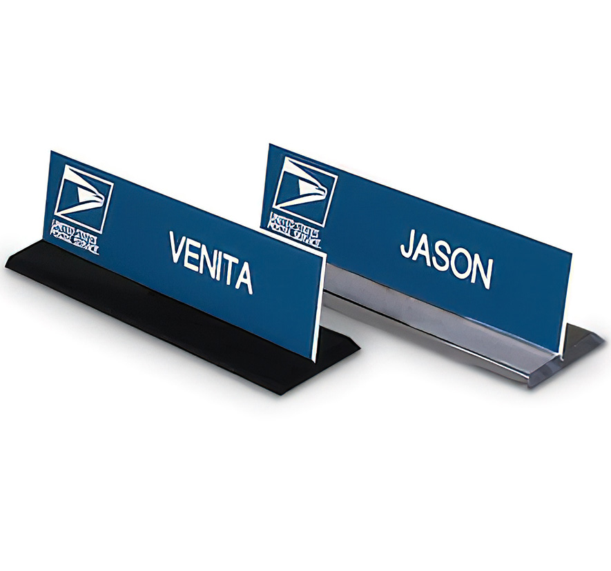 This well-designed, quality Desk Sign is the epitome of professionalism. Place nameplates at employee's desks to provide a sense of personalization. The portable plates can easily slide out of the acrylic holders and be moved to new holders, if necessary. Choose from Helvetica, Roman, and Script font styles -- engraved in all capital letters.