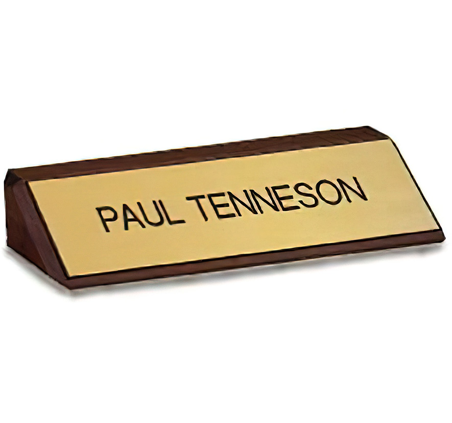 This well-designed, quality Desk Sign is the epitome of professionalism. Place nameplates at employee's desks to provide a sense of personalization. The portable plates can easily slide out of the walnut holders to be moved to new holders, if necessary. Choose from Helvetica, Roman, and Script font styles -- engraved in all capital letters.