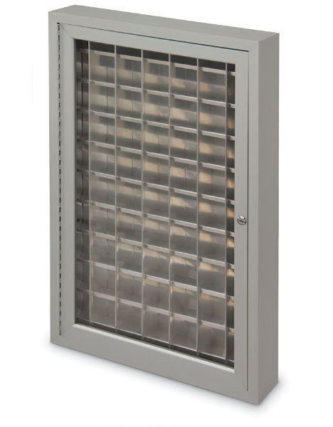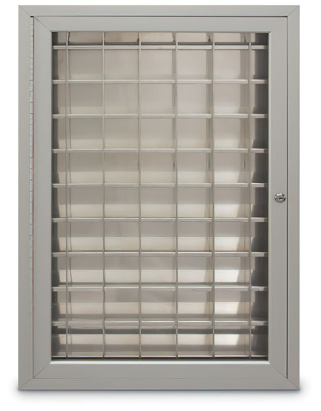 This lightweight, yet surprisingly strong, design maximizes space by allowing for the storage of up to 70 Letter Carrier route keys and Carrier gas credit cards. An all-aluminum construction and a Plexiglass window ensure durability, as well as easy wall mounting.