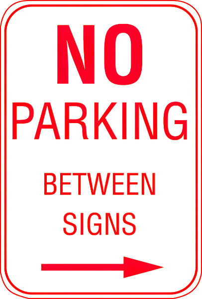 TYPE: STREET SIGN. Aluminum Parking Lot Sign. WORDING: "NO PARKING BETWEEN SIGNS (Right Arrow)." SIZE: 12" x 18". COLOR: BLACK ON WHITE. SIGN POSTS: Sold separately. See N1026445. ACCESSORIES N1014758-N1014759 Fence Mount Brackets. SHIPPING: USPS.