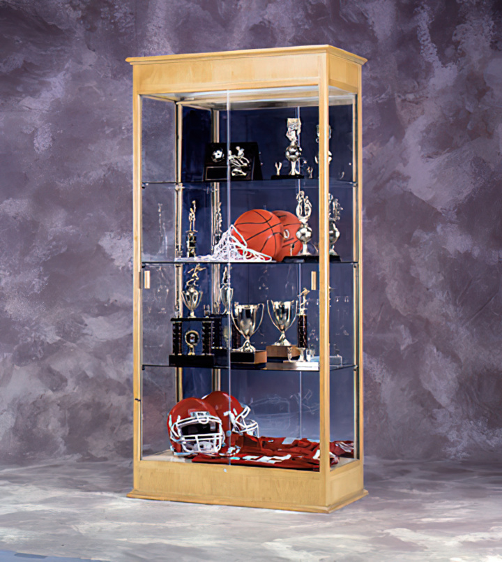 Display merchandise, stamps, or employee awards in the Solid Varsity Oak Floor Case with a cove molding that beautifully accents the oak case exterior. Built-in lighted cornice highlights your collection on 3 adjustable shelves, while quality locks and tempered glass provide added security. The well-crafted display cases match any decor.
