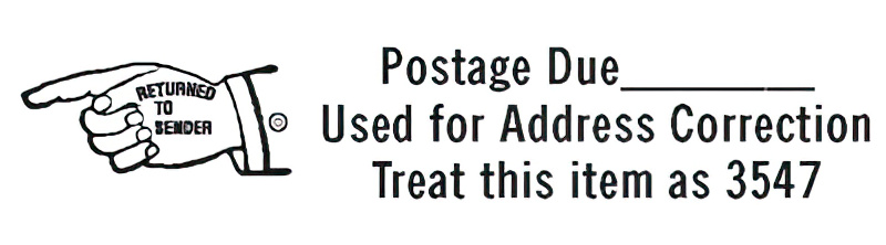 This returned to sender stamp reads, "Postage Due. used for Address Correction Treat this item as 3547". The easily refillable phrase stamps are good for thousands of impressions before re-inking. Custom stamps are available with your copy, city, and state.