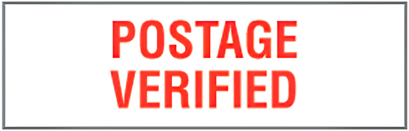 TYPE: Rubber Stamp. IMPRESSION: "POSTAGE VERIFIED." IMPRESSION SIZE: 1/2"H x 1-11/16"W. INK COLOR: None. MOUNT: Made with ergonomically designed plastic handle, high-quality laser-cut rubber die. PLEASE NOTE: INK PAD SOLD SEPARATELY (). ACCESSORIES: Refill Ink, model numbers N1024685-N1024694, Stamp Pad: model numbers N1015892, N1015447, N1002548-N1002549. SHIPS: USPS.
