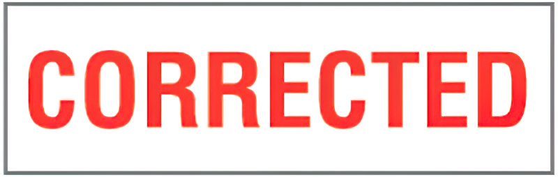 TYPE: Rubber Stamp. IMPRESSION: "CORRECTED." IMPRESSION SIZE: 1/2"H x 1-11/16"W. INK COLOR: None. MOUNT: Made with ergonomically designed plastic handle, high-quality laser-cut rubber die. PLEASE NOTE: INK PAD SOLD SEPARATELY (). ACCESSORIES: Refill Ink, model numbers N1024685-N1024694, Stamp Pad: model numbers N1015892, N1015447, N1002548-N1002549. SHIPS: USPS.