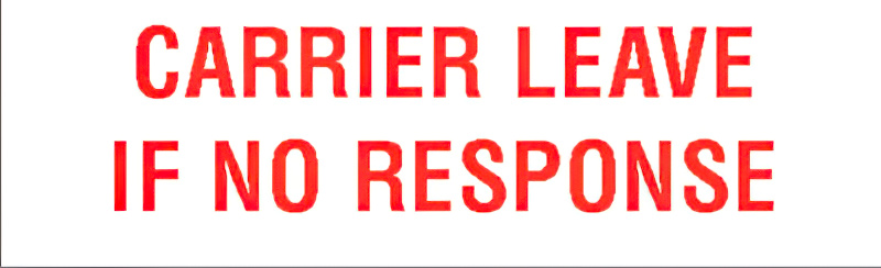 TYPE: STAMP. Stock Pre-Inked Stamp. IMPRESSION: "CARRIER LEAVE IF NO RESPONSE" IMPRESSION SIZE: 1/2"H x 1-11/16"W. INK COLOR: Black. MOUNT: Made with an ergonomically designed plastic handle and features a retractable frame, eliminating the need for messy stamp pads and keeping stamps out of contact with your desk. Gives thousands of impressions before needing to be re-inked (). ACCESSORIES: Refill Ink, model numbers N1024685-N1024694 . SHIPS: USPS.