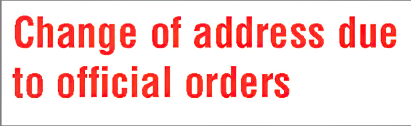 TYPE: STAMP. Stock Pre-Inked Stamp. IMPRESSION: "CHANGE OF ADDRESS DUE TO OFFICIAL ORDERS" IMPRESSION SIZE: 1/2"H x 1-11/16"W. INK COLOR: Black. MOUNT: Made with an ergonomically designed plastic handle and features a retractable frame, eliminating the need for messy stamp pads and keeping stamps out of contact with your desk. Gives thousands of impressions before needing to be re-inked (). ACCESSORIES: Refill Ink, model numbers N1024685-N1024694 . SHIPS: USPS.