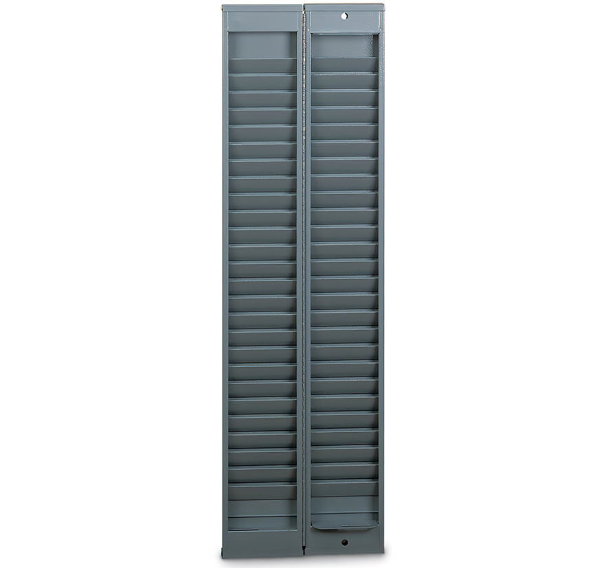 This 50-capacity cabinet has a lock included and mounted in the bottom, rack folds in half. Use the rack to keep badges organized and locked away when necessary. All styles designed for wall mounting. Model can be secured.