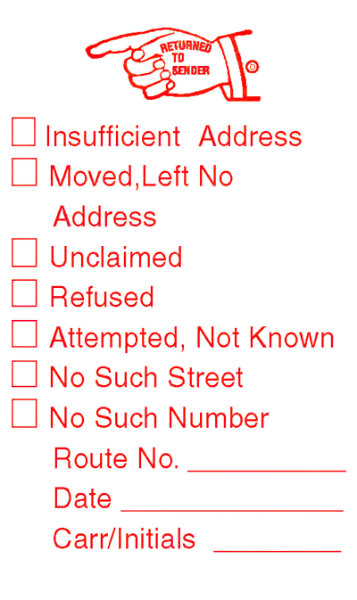 Stamp returned to sender mail with this rubber stamp and mark one or more of the following "reason checked" boxes, as shown: