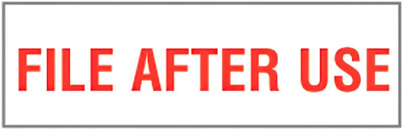 TYPE: Rubber Stamp. IMPRESSION: "FILE AFTER USE." IMPRESSION SIZE: 1/2"H x 1-11/16"W. INK COLOR: None. MOUNT: Made with ergonomically designed plastic handle, high-quality laser-cut rubber die. PLEASE NOTE: INK PAD SOLD SEPARATELY (). ACCESSORIES: Refill Ink, model numbers N1024685-N1024694, Stamp Pad: model numbers N1015892, N1015447, N1002548-N1002549. SHIPS: USPS.