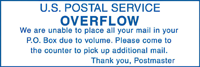 Label reads, "U.S. Postal Service Overflow. We are unable to place all your mail in your P.O. Box due to volume. Please come to the counter to pick up additional mail. Thank you, Postmaster."