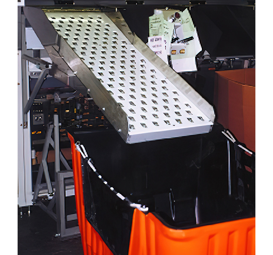Conveyors are an after market addition which increases the productivity and versatility of the SPBS machine. Installing these conveyors on alternating chutes creates a "staggering" effect that allows for the use of Wiretainers, BMCs, Gaylords, etc. to be used as SPBS sweepside equipment. (Conveyor accommodates containers up to 42" in height. The tallest rolling stock is a wiretainer at 41 1/2"). The number of useable chutes can be maximized, while decreasing the amount of rejects due to tub or sack overflow. Jams due to inferior extension chutes are eliminated. Parcels 1/4 lb. and as small as 4" x 4" travel down the conveyor even at an 11 degree incline. The special design created by Postal Products and the USPS effortlessly changes the vector of travel for flawless parcel flow. A demo unit is available for installation and trial on any phase SPBS machine. Call the customer service line to register for the demo unit.