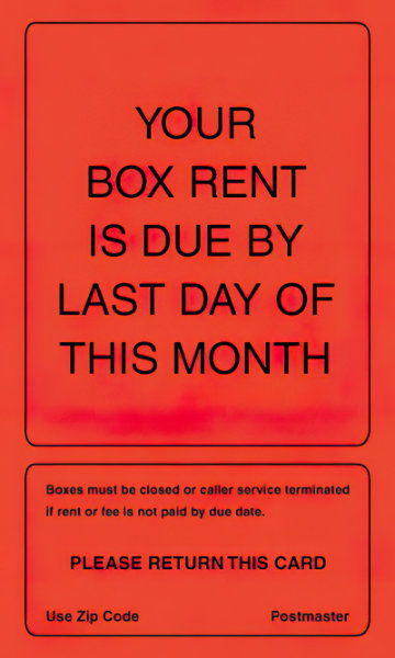 Use this Box Rent Due carrier form card to inform carriers, postal workers and customers of necessary precautions and procedures. This mail carrier card will get the attention of intended recipients. Carrier cards are sold 500 per box and measure 8-1/2" x 5-1/2".