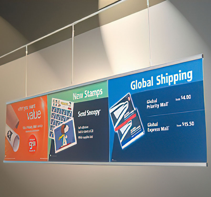 Use this sign hardware to hang graphics from the ceiling, wall, or window. Once installed, units are easily changeable. Simply snap open the side load frame, remove the plastic protector, change the graphics in the protector, and place the plastic protector back in the frame.