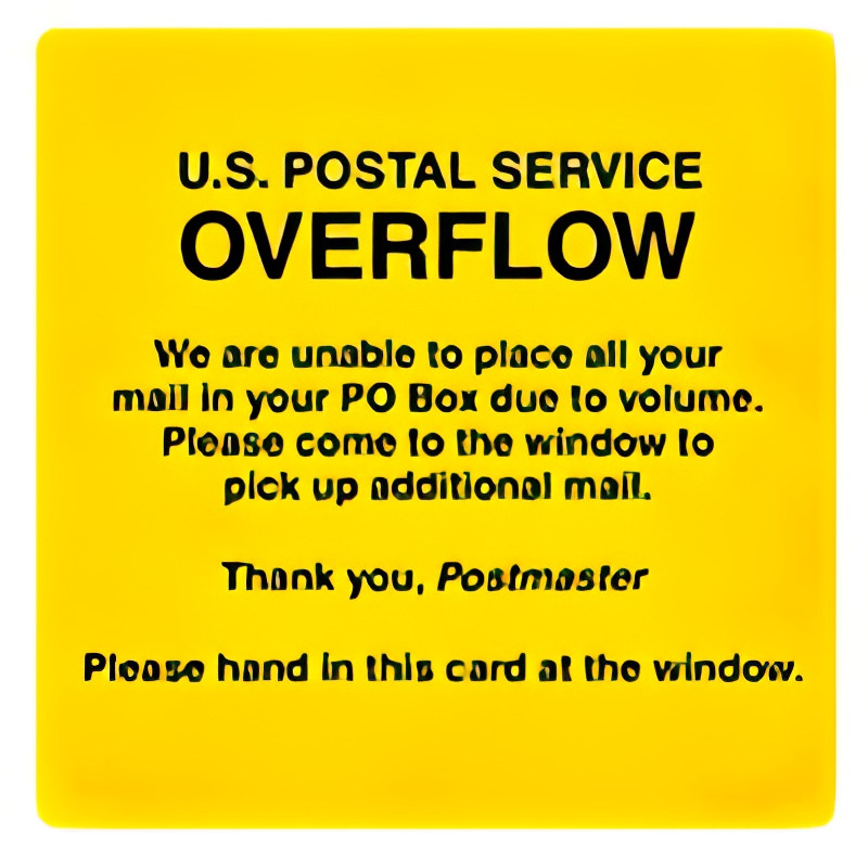 When a customer's P.O. box has reached capacity, use this plastic card to tell them that more mail is waiting for them. The bright Yellow color makes it easily identifiable while the large letters make it easy to read.