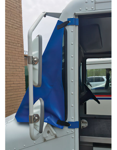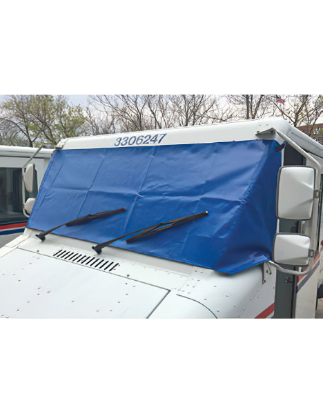 LLV windshield and mirror covers keep ice and snow from forming or sticking to windshield and mirrors, so Letter Carriers don't have to scrape or brush windows and mirrors clean. The postal windshield cover attaches by closing two metal hooks located on the end of the cover between the door and the door frame, and then pulling the cover over the window and hooking it onto the opposing door frame. These covers are an excellent option for LLVs that are parked outside overnight! Each cover is specifically designed for LLVs, constructed of durable Marine Vinyl and allows for an easy, one-person installation. The overall design of this postal vehicle cover includes windshield cover, 2 large side mirror covers, 2 small side mirror covers, 2 guide mirror coves, and 1 storage bag. Ships USPS.