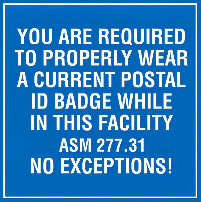 Post this sign at every entrance throughout a facility to generate awareness of ID Badge regulations. Notice will help maintain security and enforce the Postal ID Badge mandate.