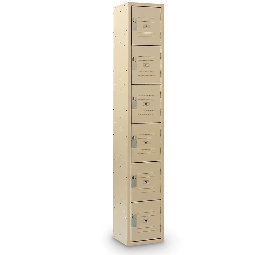 Premium Wardrobe Lockers offer maximum storage space in a modern design. Six Tier Lockers feature 6 in. high legs, a classic formed stainless steel recessed handle, and a double-prong hook. The wardrobe lockers accept padlocks or built-in locks (not included). Ships fully assembled.