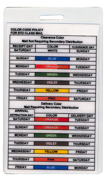All the necessary information on one handy card! The laminated Color Code Policy Card readily displays a processing center's color code policy and BBM conversion rates. Information is standard as shown, and can be changed as needed. Please double-check copy prior to purchase.